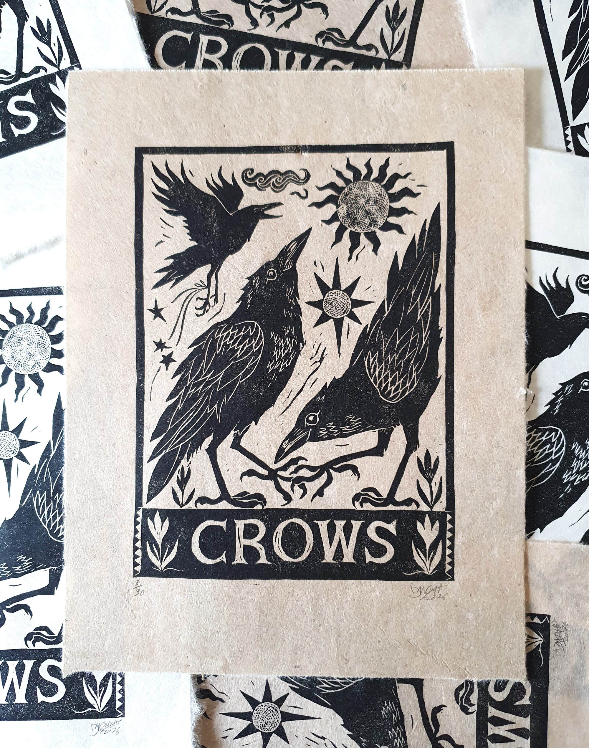 A limited edition original linocut print. This design has been hand burnished onto Nepalese natural lokta paper which contains tiny pieces of bark. Due to the nature of the hand printing process, each print is unique in that it will have slight variations
