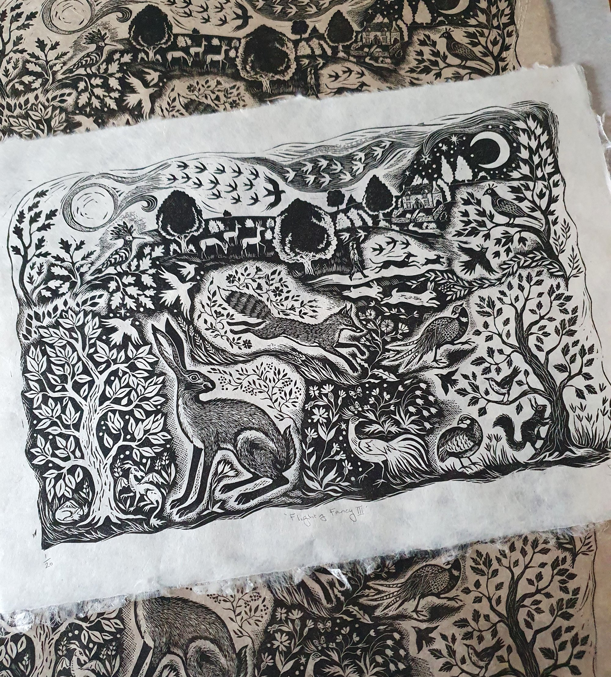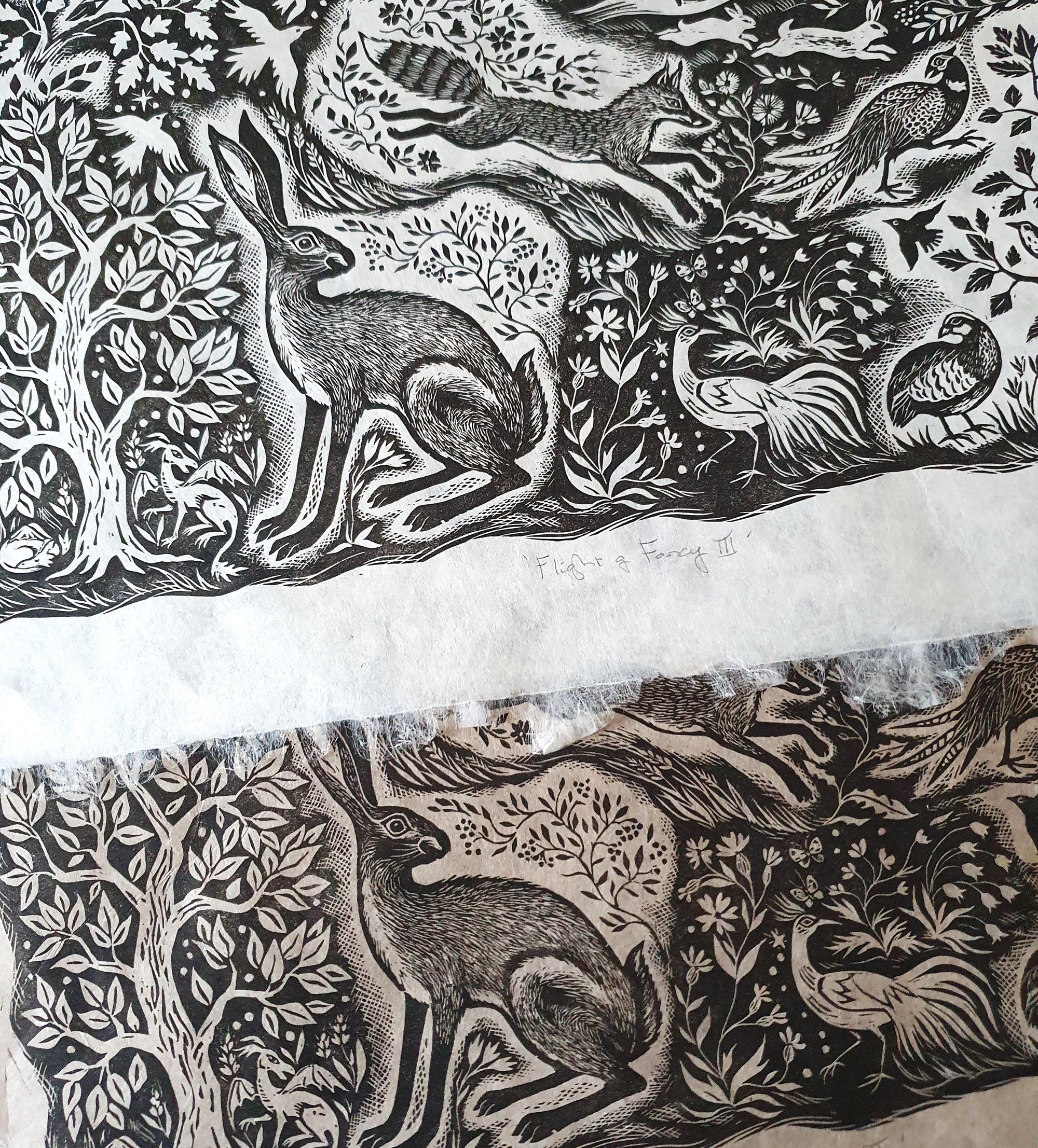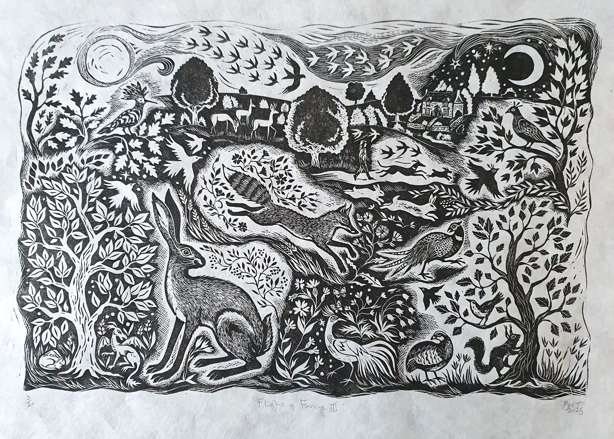 Original limited edition linocut print. A variation on the original 'Flight of Fancy' in landscape format inspired by nature and folkloric art with a Fantastical twist!
