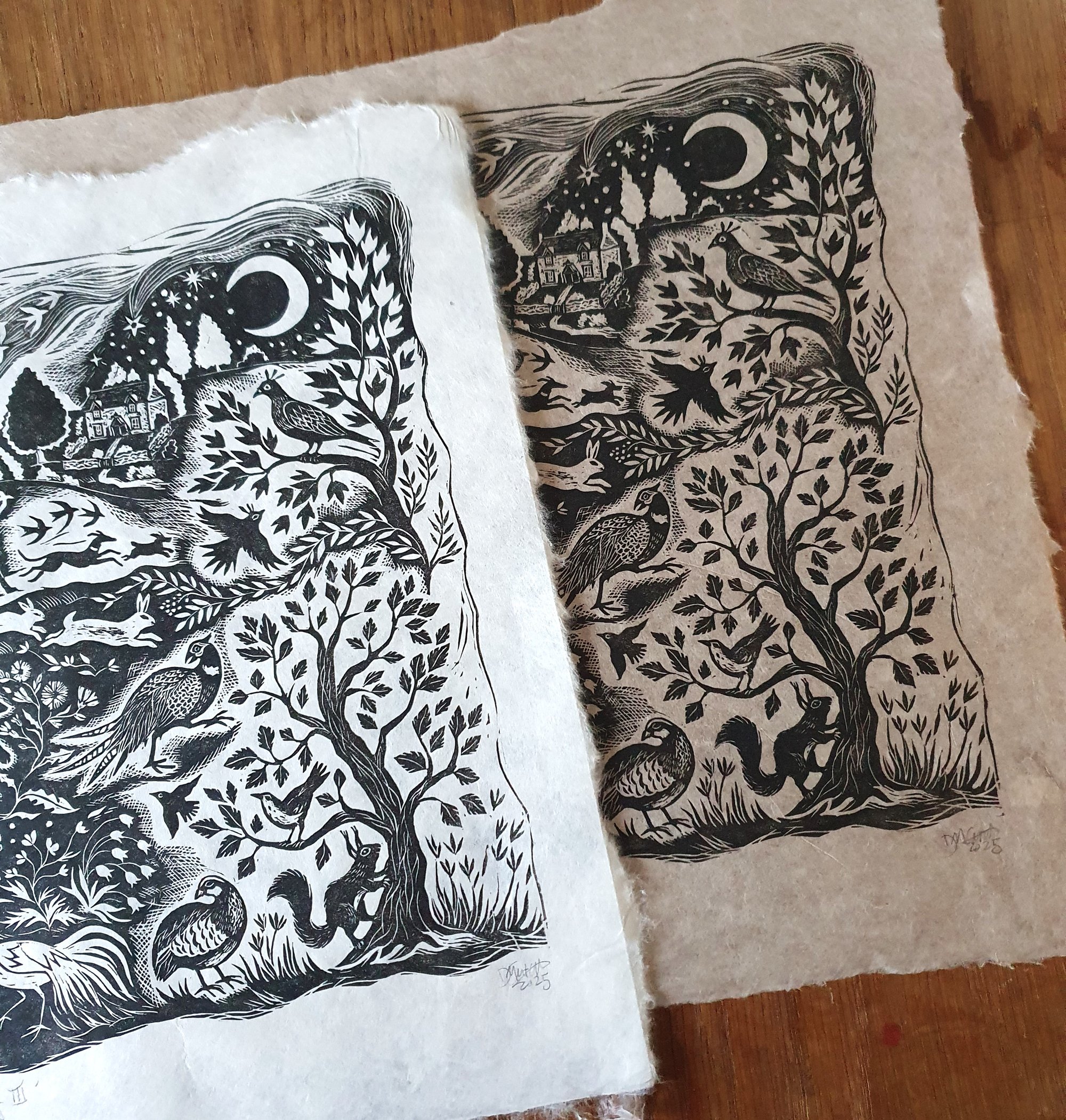 Hand burnished onto japanese kozo paper which is strong and light-weight (46gsm). Due to the nature of the hand printing process, every print will have slight variations making each one unique.