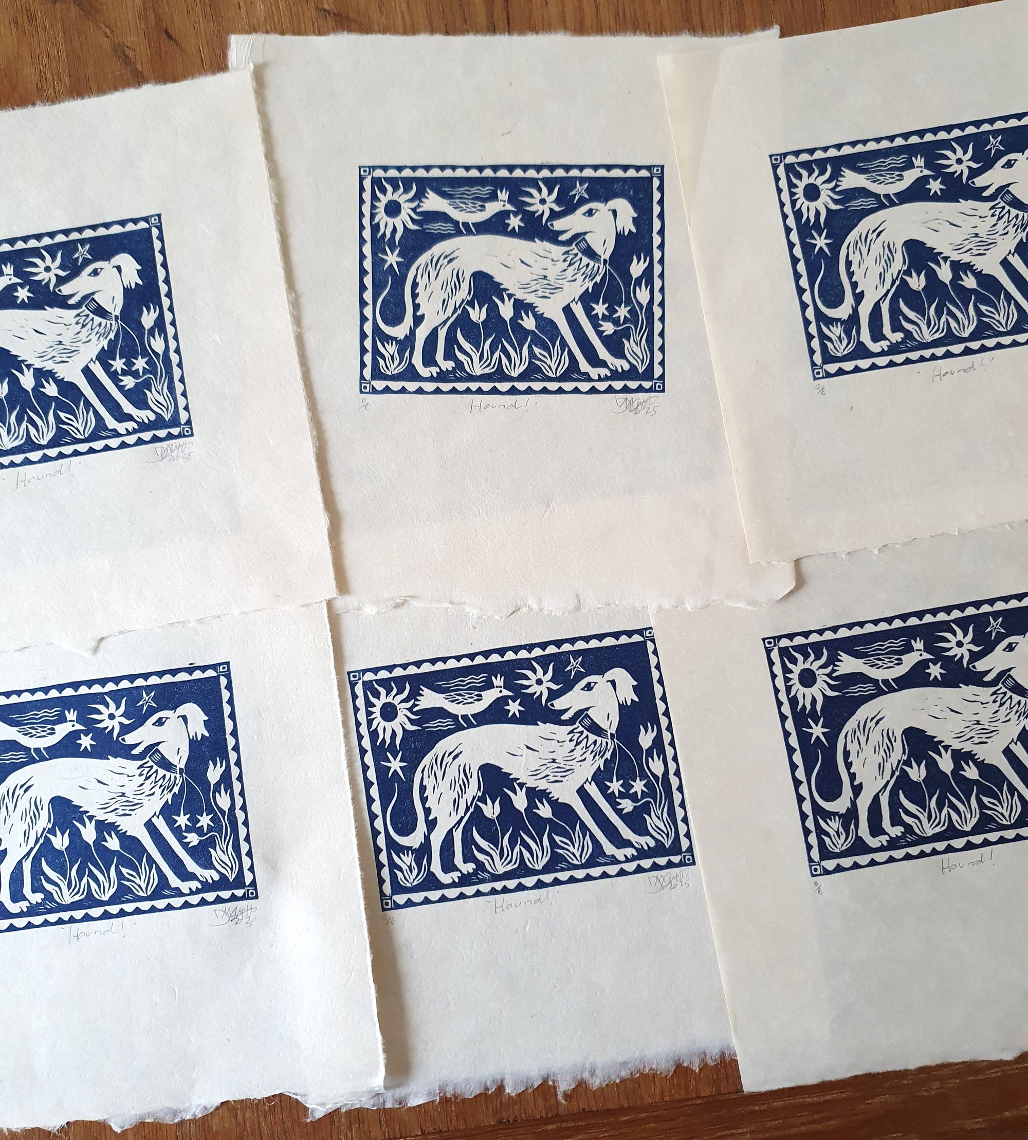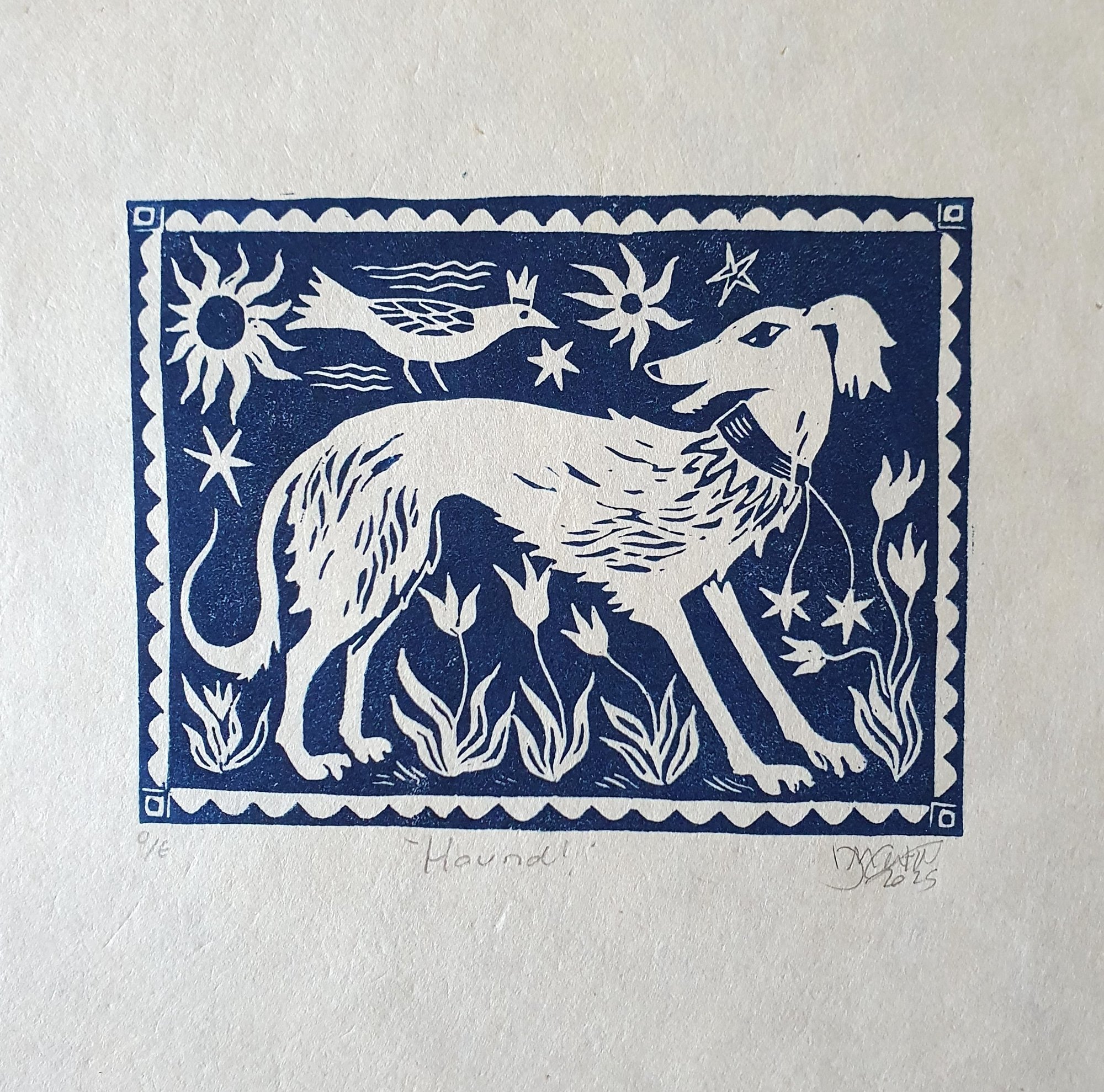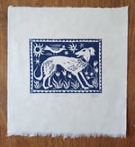 Original linocut print of a Little Hound. A composite of the large linocut 'Birds and Beasties' and now a little artwork in itself.
