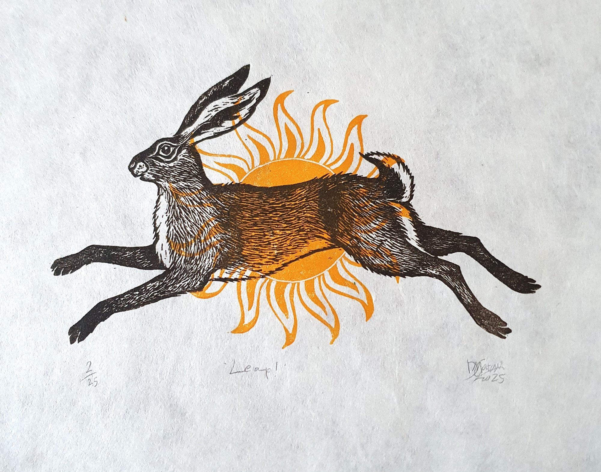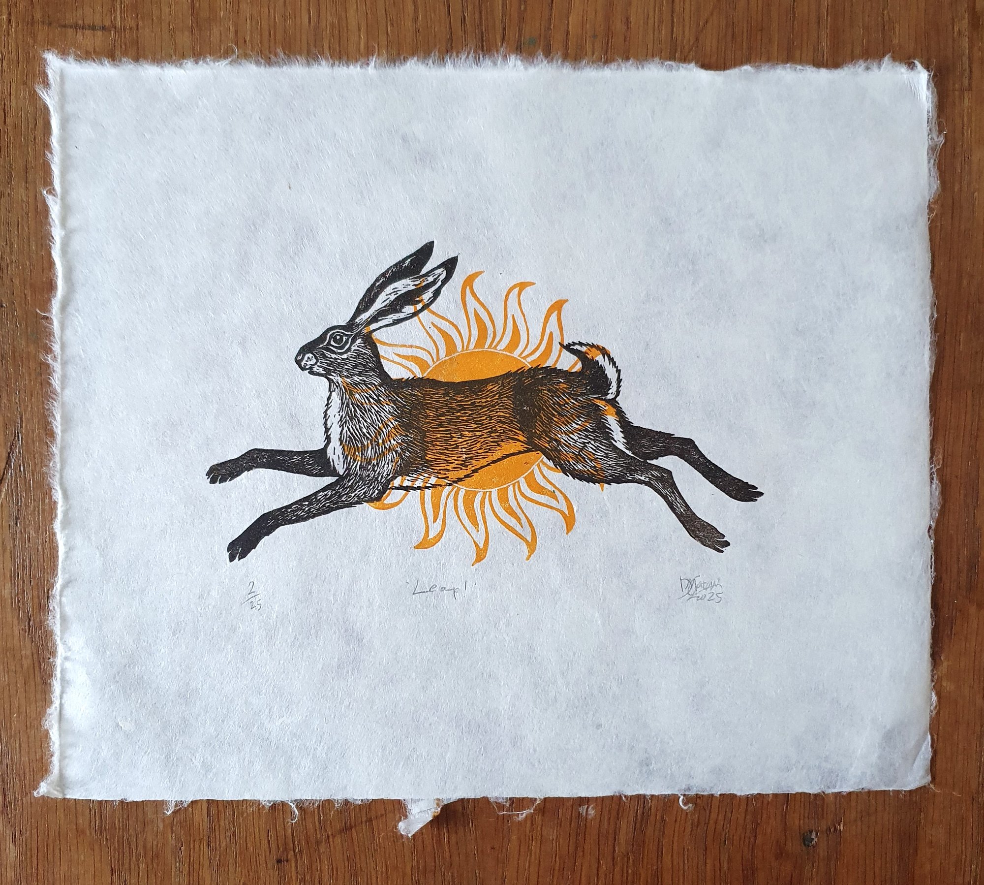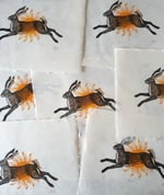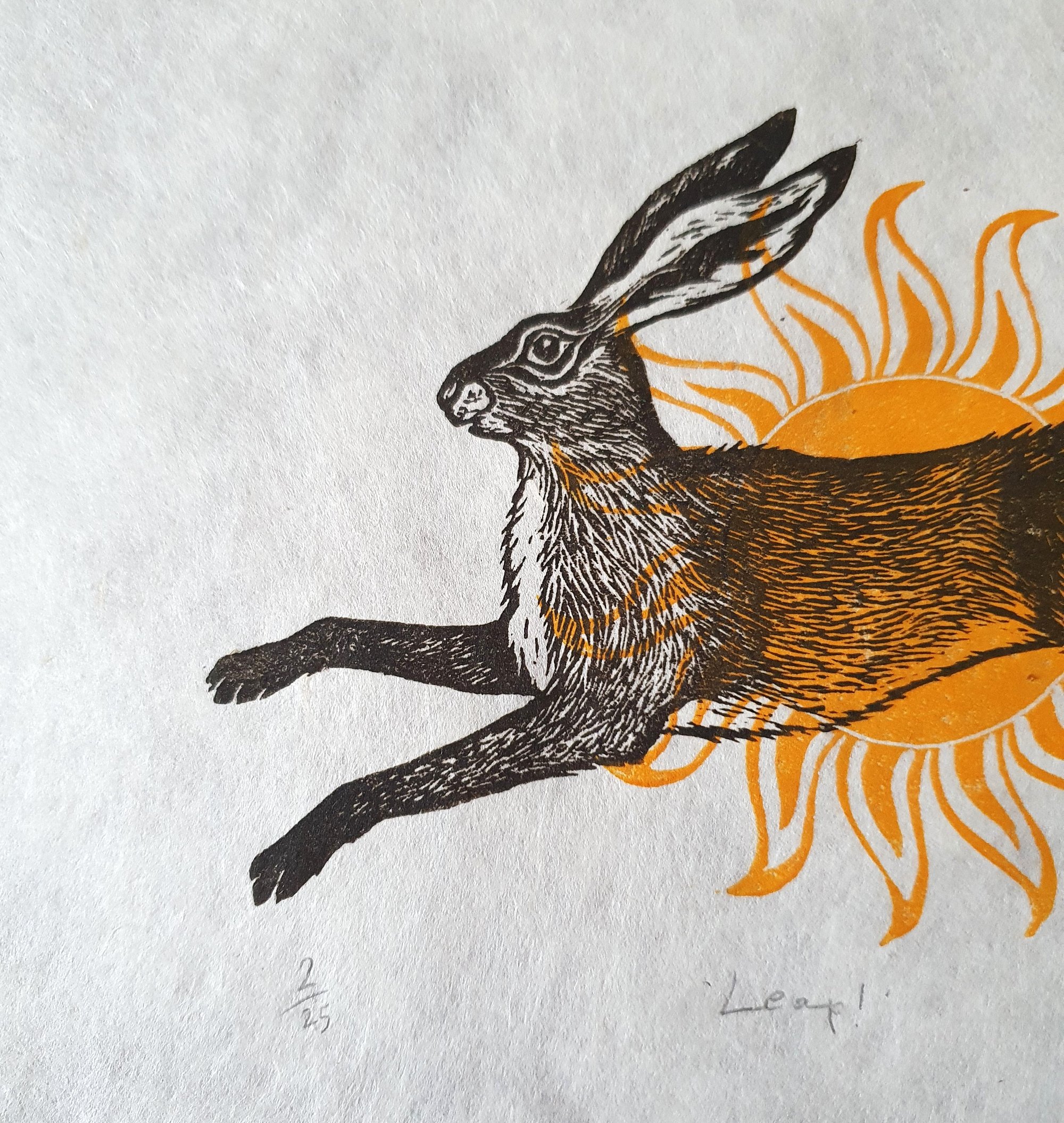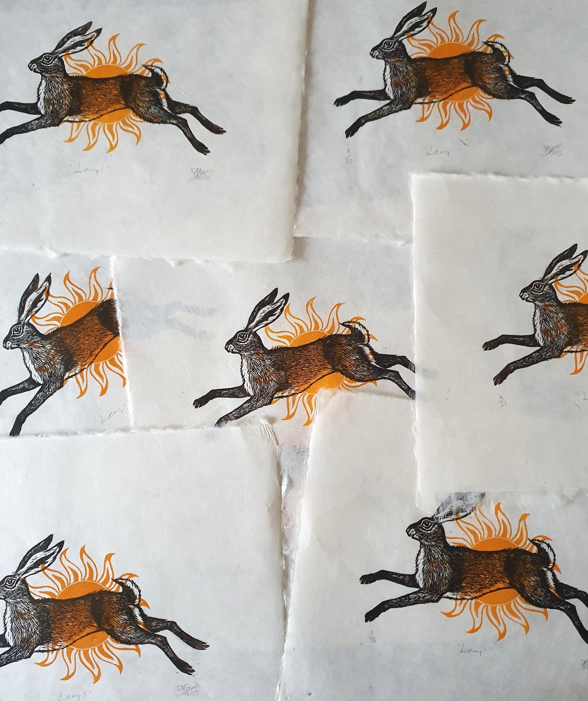 Original limited edition print. A simple two block print of a leaping hare against a jolly orange sun! Hand burnished onto japanese kozo paper; a light-weight (46gsm) paper that is very strong. Due to the hand printing process, each print will have slight variations making every print unique.