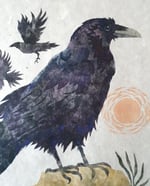 Original monoprint of a Raven. This artwork is made using the stencil method. Printmaking inks are applied by hand to Nepalese mitsumata paper using various mark making implements to create layers of colour and texture.